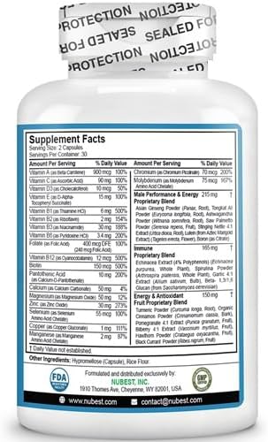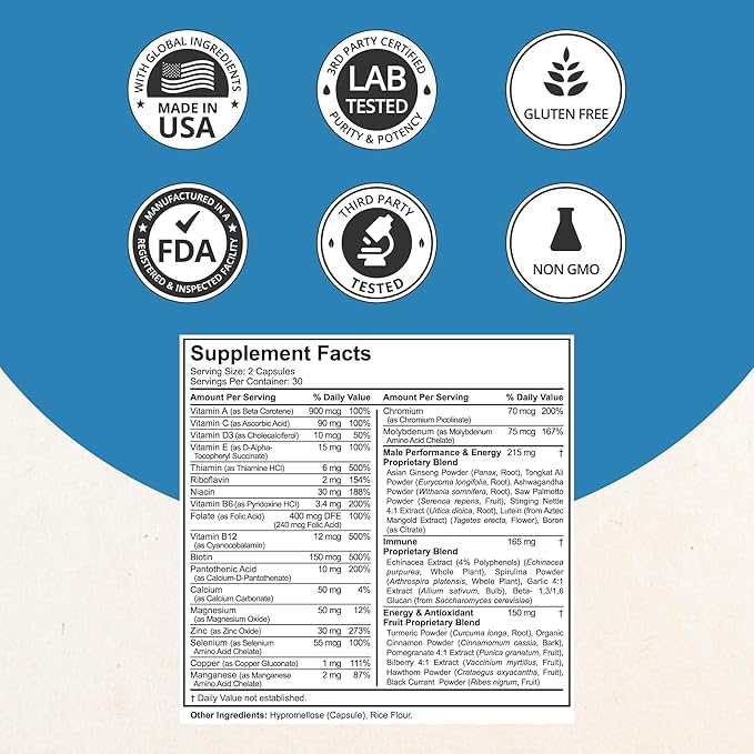 - Immunity and Health Support: Powerful botanical blends together and multivitamins for men like Vitamins A, C, E, and Zinc, help promote overall health and wellness by combating free radicals and strengthening the immune system.