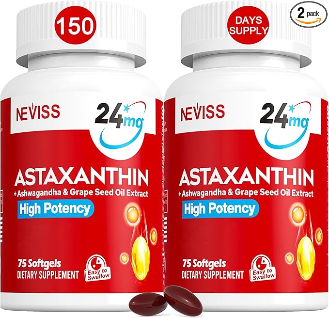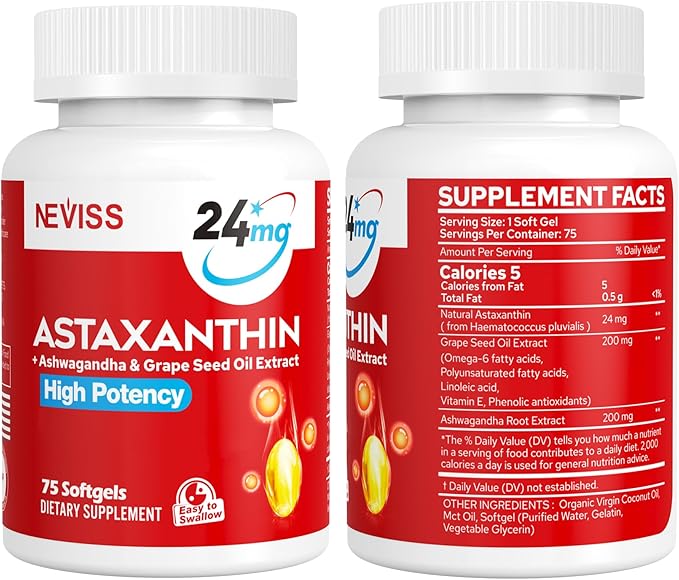 - 5-in-1 Better Absorption: NEVISS High Absorption & Potency 24 mg Astaxanthin Softgels provide natural astaxanthin, a fat-soluble antioxidant carotenoid derived from microalgae Haematococcus pluvialis, combined with ashwagandha root extract and grape seed Oil extract that increase nutrient absorption by 99%. This astaxanthin supplement helps to fight free radicals, supports skin, eyes & immune health. Ashwagandha also helps with relaxation, promote better rest.