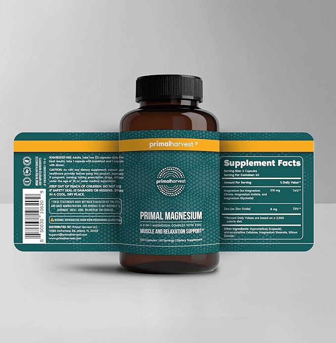 Magnesium Supplement Complex 310mg by Primal Harvest with Magnesium Glycinate, Citrate, Malate, and Zinc 120 Capsules