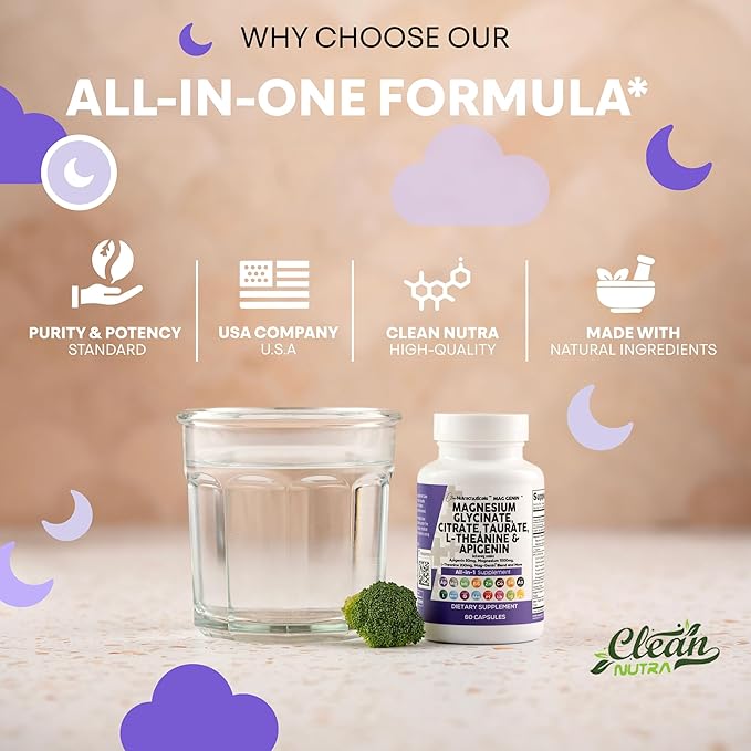 - The Ultimate Magnesium Supplements You've Been Looking For - Clean Nutra's Mag Genin provides 5 full dose products in one, containing a full Magnesium Taurate and Glycinate, Magnesium Citrate Capsules, Theanine 200mg Capsules, and Apigenin. Stronger than most pure magnesium glycinate capsules, magnesium citrate liquid, l theanine 100 mg and magnesium glycinate liquid. This revolutionary product that makes products like magnesium malate capsules and chelated magnesium glycinate old fashioned.
