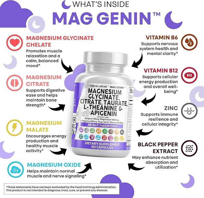 - Advanced Triple Magnesium Complex For Women And Men - Mag Genin is a Magnesium Supplement that contains Magnesium Citrate, Magnesium Glycinate Capsules, Magnesium Taurate, and Magnesium Malate. This supplement also has L Theanine 200mg, and a full Apigenin Supplement. Don't settle for average magnesium glycinate 400mg, magnesium glycinate 500mg, or magnesium glycinate gummies and enjoy an all inclusive Magnesium Complex Supplement packed into 2 easy to take magnesium capsules by Clean Nutra.