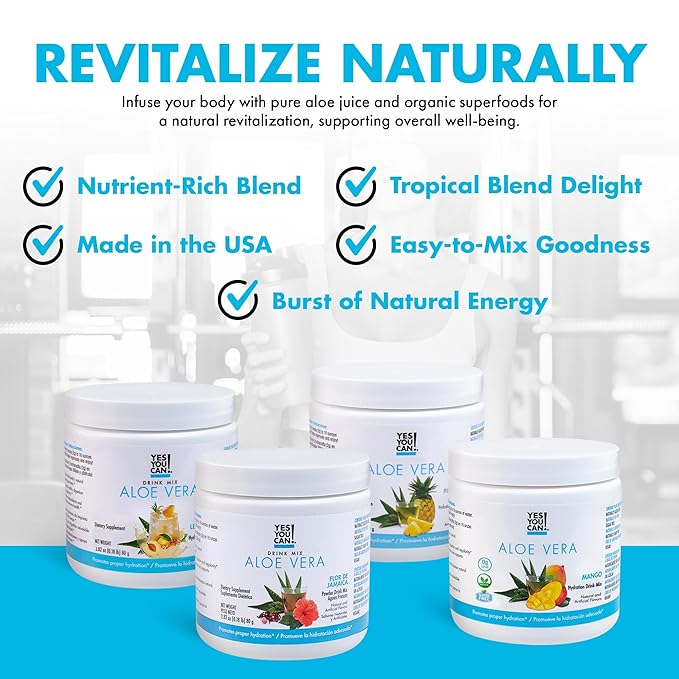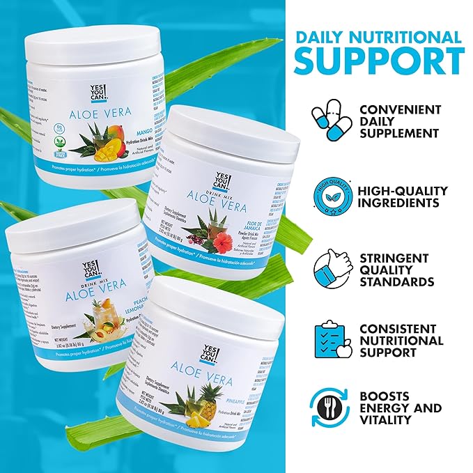 - PROMOTES PROPER HYDRATION: Yes You Can! Aloe Vera Drink Mix is an ideal organic drink mix for dehydration. Stay hydrated in a delicious and healthy way with a water-dense plant like aloe vera. At Yes You Can, we pride ourselves on using all natural ingredients in our supplements.