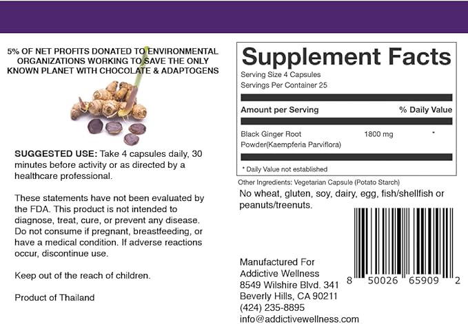 Addictive Wellness Black Ginger Capsules 450mg, Kaempferia Parviflora Supplement to Support Energy, Metabolism, Endurance & Performance, Thai Black Ginger for Men, Vegan & Paleo, 100 Count