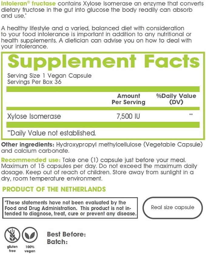 - PREVENT ABDOMINAL DISCOMFORT - With 36 fast-acting capsules, this product helps prevent gas, bloating, abdominal pain, and diarrhea associated with intolerance to fruits, sweets, and sugary drinks (fructose intolerance). Fructase has a direct effect when consumed.