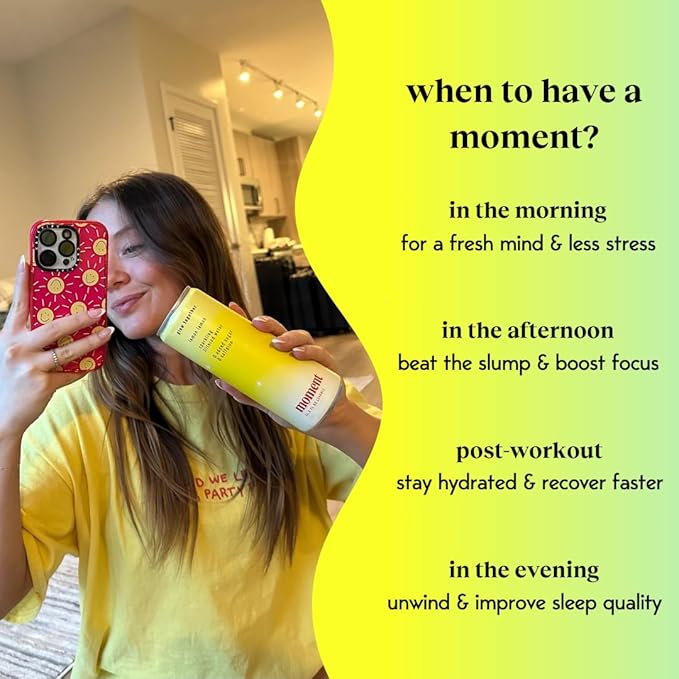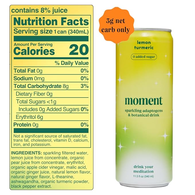 - DITCH THE SUGAR & ENJOY GOOD-FOR-YOU INGREDIENTS: Moment adaptogen drink has zero added sugar, zero caffeine, zero alcohol, and 20 calories only per can. It’s made with refreshing lemons and immunity-boosting turmeric to support gut health and improve overall wellness.
