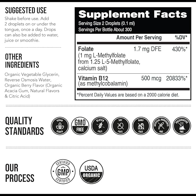 Organic Methyl Folate 1000 mcg + Methyl B12 Cofactor (300 Servings) – Metabolically Active 5-MTHF Form, Organic Berry Flavor, Liquid Sublingual Form – Mood, Cognition, Methylation, Pregnancy (1oz)