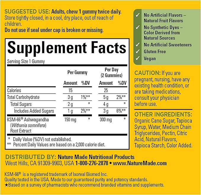 - Stress support supplement: contains one 60 count bottle of Nature Made Ashwagandha Gummies for a 30-day supply