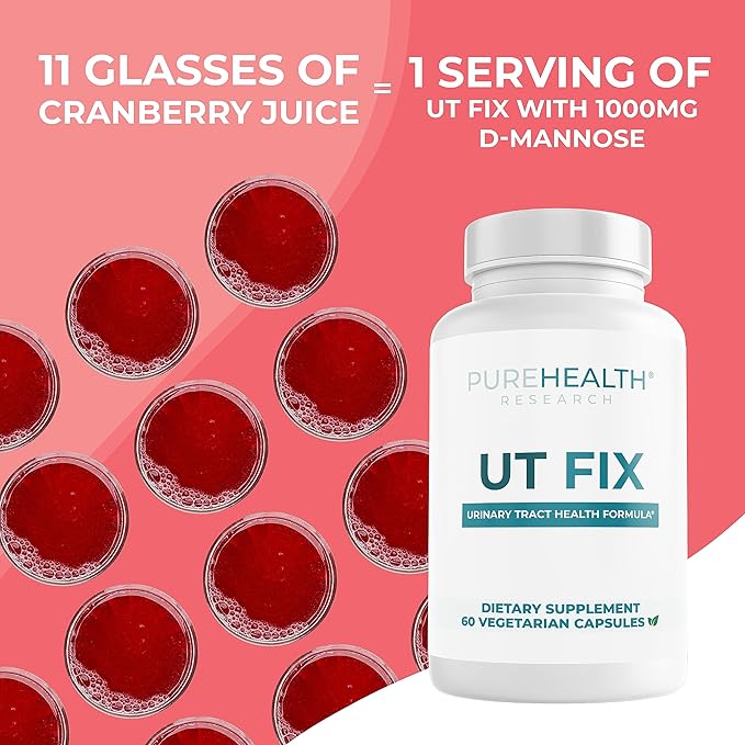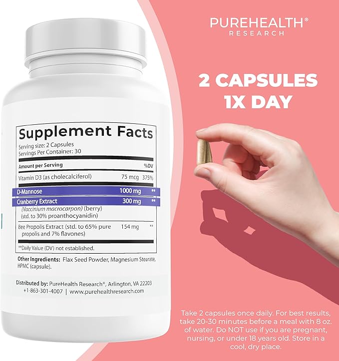 PUREHEALTH RESEARCH UTIFIX D Mannose with Cranberry Long-Term Supplement - D-Mannose for UTI 1000mg Capsules + 300mg Cranberry Extract + Propolis for Urinary Tract Health for Women and Men, 60 Count