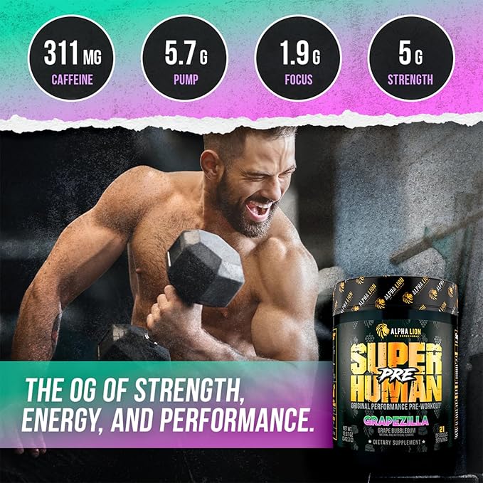 ALPHA LION Superhuman Pre Workout Powder, Beta Alanine, L-Taurine & Tri-Source Caffeine for Sustained Energy & Focus, Nitric Oxide & Citrulline for Pump (21 Servings, Grapezilla)