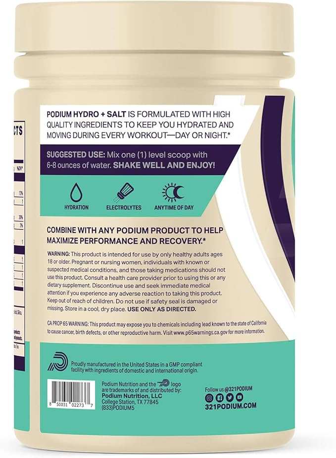 - HELPS SUPPORT A HEALTHY BODY: Podium Nutrition, BCAA Powder, Hydro + Salt provides needed electrolytes and hydration for an active lifestyle. Plus, BCAAs have been shown to build muscle, decrease muscle fatigue, and alleviate muscle soreness. Podium Hydro + Salt is formulated to keep you moving well during and after a workout.