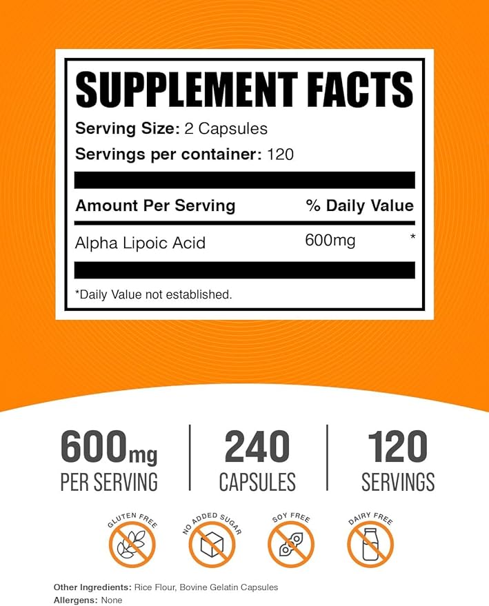 BulkSupplements.com Alpha Lipoic Acid Capsules - ALA Supplement, Alpha Lipoic Acid 600mg - Gluten Free - 240 Capsules (Pack of 1)