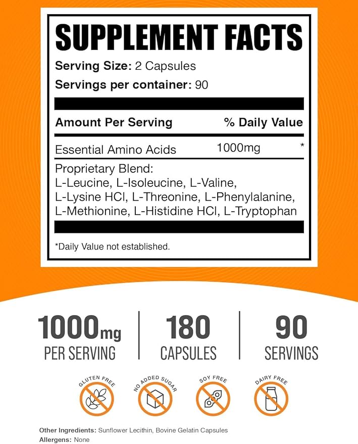 BulkSupplements.com Essential Amino Acids Capsules (EAA) - Amino Acids Supplement - EAAs Amino Acids - EAA Capsules - 1000 mg Serving - 90 Day Supply (180 Gelatin Capsules)