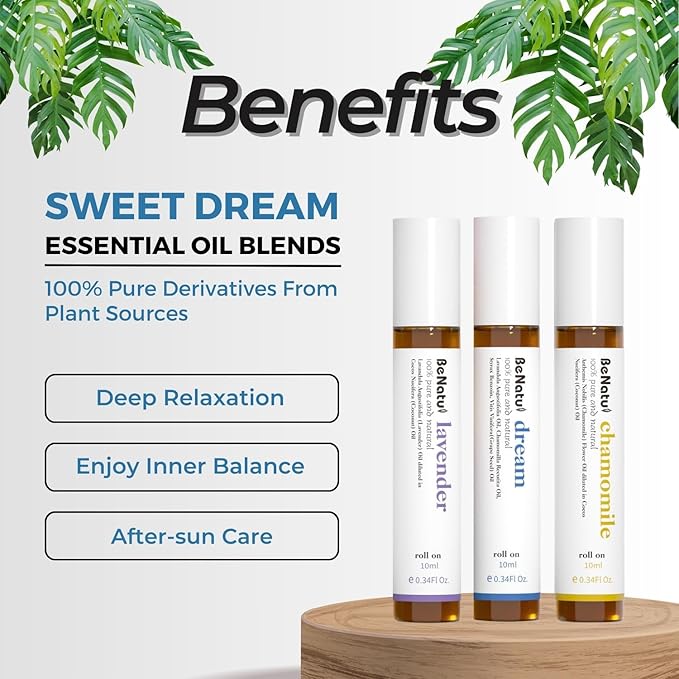 Benatu Essential Oil Roll On Set (Dream, Lavender, Chamomile), Aromatherapy Roller for Massage, Body Skin Care, Home - Natural Fragrance Gift for Women and Men