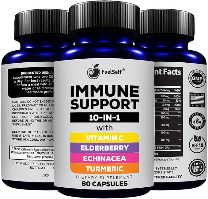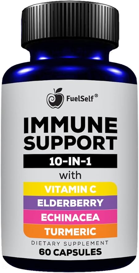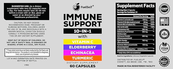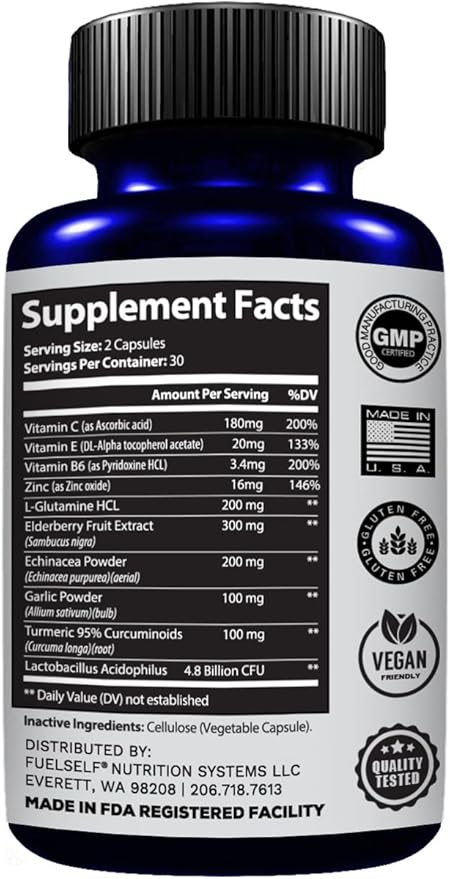 Immune Support Booster Supplement with Elderberry, Vitamin C, Echinacea, Turmeric Curcuminoids, Vitamin E, Vitamin B6, Zinc, L-Glutamine HCL, Garlic, Lactobacillus Acidophilus :: 60 Count, 1 Pack