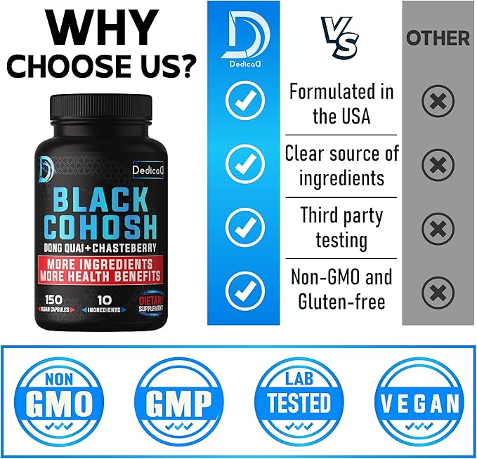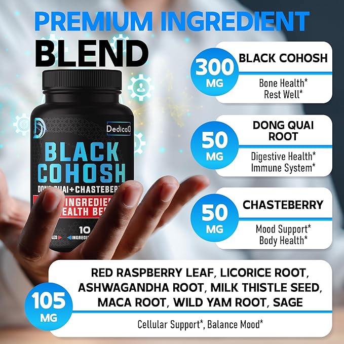 - 💚 Dedicad Menopause Black Cohosh Complex has the potential to support menopausal symptoms, a positive mood, smooth skin, and bone health; A great choice for you if you're looking for a natural way to improve your overall well-being.