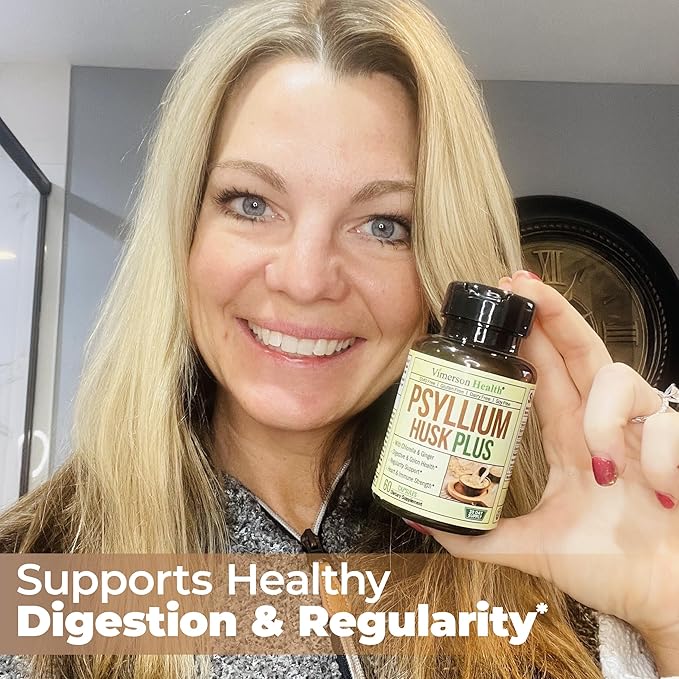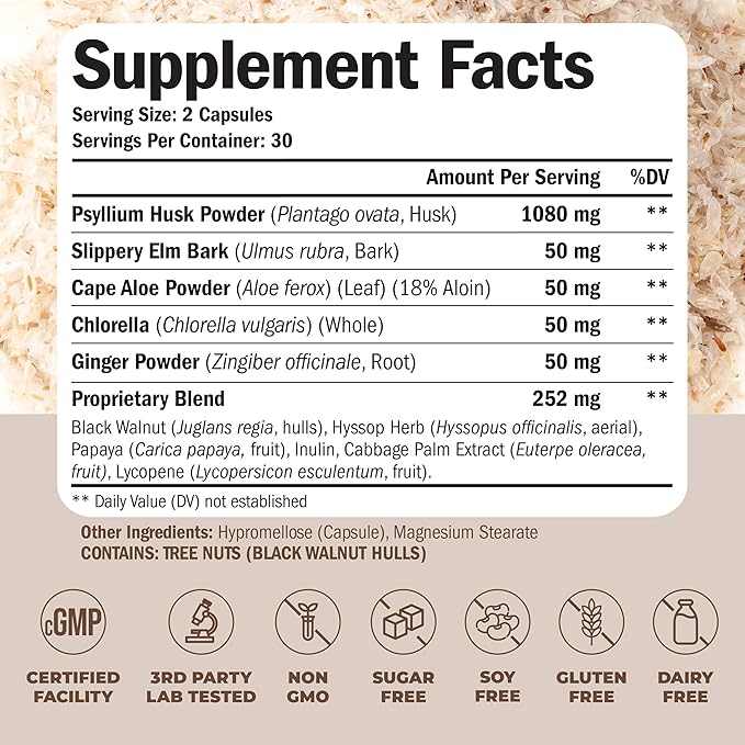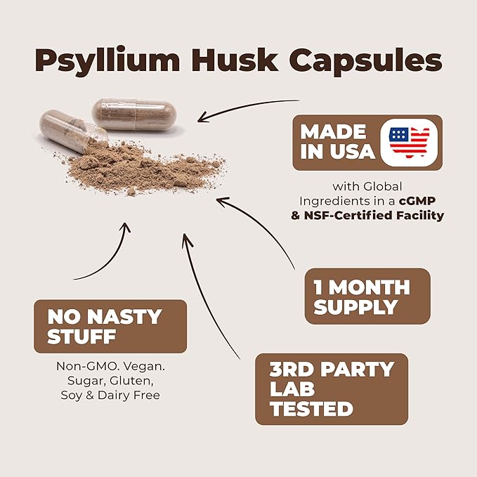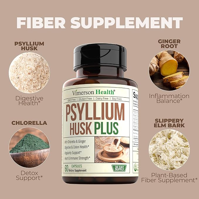 - Product Benefits : Digestive Regularity Support – Psyllium Husk fiber capsules naturally absorb water in the gut, forming a gentle gel-like bulk that supports healthy elimination and helps maintain regularity as part of your daily wellness routine.*, Gut & Colon Health – Each serving blends Psyllium Husk with antioxidant-rich botanicals to nourish gut lining and promote overall colon health, making it a clean-label solution for those focused on long-term digestive wellness.*, Increase Your Daily Fiber Intake – A convenient capsule alternative to messy fiber powders, these psyllium fiber capsules help increase your daily fiber intake - perfect for busy individuals looking to support satiety and stay fuller for longer.*, Supports Digestive Comfort – Formulated with plant-based fiber, Ginger Root, and Slippery Elm Bark to help ease occasional digestive discomfort - ideal for adults 35+ seeking natural digestive support.*, Trusted Clean-Label Formula – Made in a cGMP & NSF-certified U.S. facility, this non-GMO, vegan supplement is third-party tested for purity and potency—free from gluten, dairy, soy, sugar, and artificial additives, with easy-to-swallow capsules.*, Whole-Body Wellness Support – This advanced fiber supplement includes Ginger and Chlorella to provide antioxidant and inflammation-balancing support, contributing to healthy digestion and overall body harmony when taken consistently.* Digestive Regularity Support – Psyllium Husk fiber capsules naturally absorb water in the gut, forming a gentle gel-like bulk that supports healthy elimination and helps maintain… See more