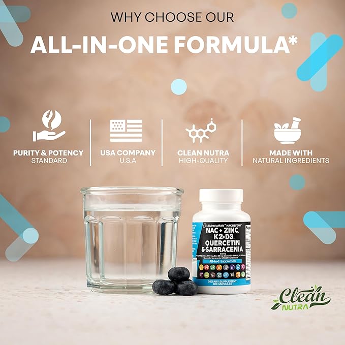 - Advanced NAC 1000mg Supplement For Women and Men - Our Nac Supplements and Vitamin K2 D3 includes 19 ingredients such as Zinc Supplements, Quercetin Supplements, Sarracenia Purpurea Extract and more! N Acetyl Cysteine with a K2 D3 Vitamin Supplement have been combined and the results are amazing. Clean Nutra has officially created the world’s most inclusive 19 in 1 Zinc With Quercetin Supplement, Vitamin D3 with K2, Saracina Purpurea and NAC N-Acetyl Cysteine capsules.