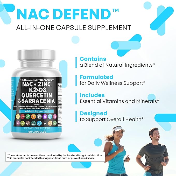 - The Vitamin K2 And D3 Supplement with N-Acetyl Cysteine NAC You’ve Been Looking For - Clean Nutra's NAC Defend provides 7 full-dose products in one, containing a full N Acetyl Cysteine NAC 1000mg Supplement, Vitamin K2 Mk-7, Vitamin D Complex, Quercetin Powder, and Zinc Supplement in a convenient 2 capsule dosage! Finally, nac n acetyl cysteine, zinc 50 mg, vit d3 k2 and quercetin with sarrasenia purpurea have been packed into one convenient solution that's quick and easy to take.