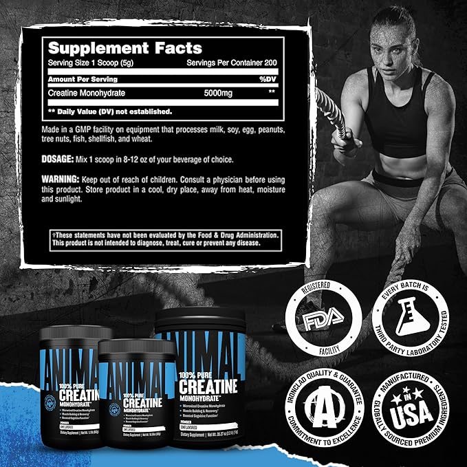 - The Power of Creatine – Increase strength, boost endurance, improve workout performance, delay muscle fatigue and promote muscle recovery with Animal Creatine Monohydrate Powder. Each serving delivers 5g of pure creatine for post & pre workout needs