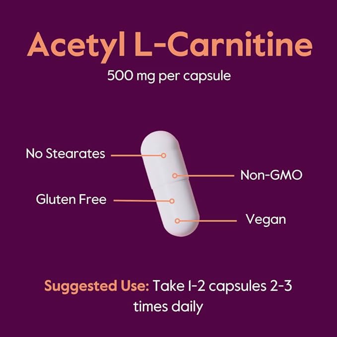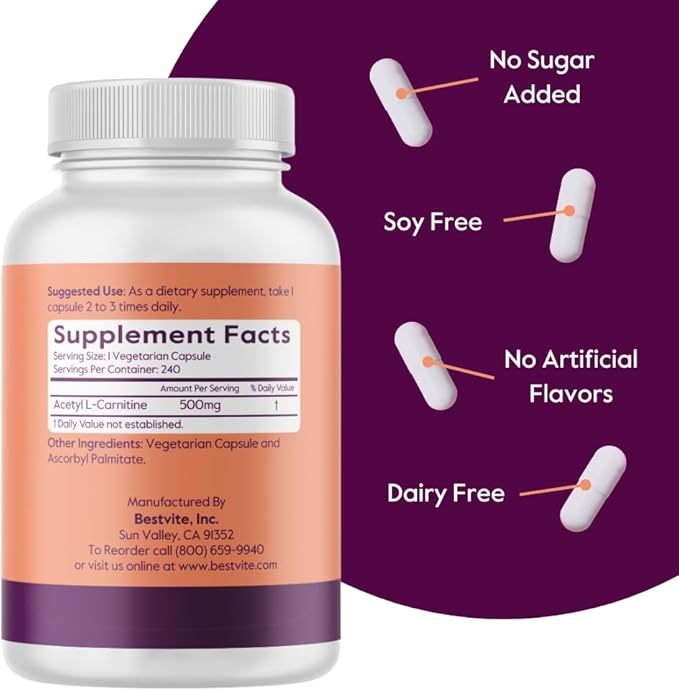 - PURE FORMULA: Bestvite’s Acetyl l-Carnitine product contains no stearates, is non-GMO, gluten-free, and vegan. Each capsule contains 500 mg of Acetyl l-Carnitine.