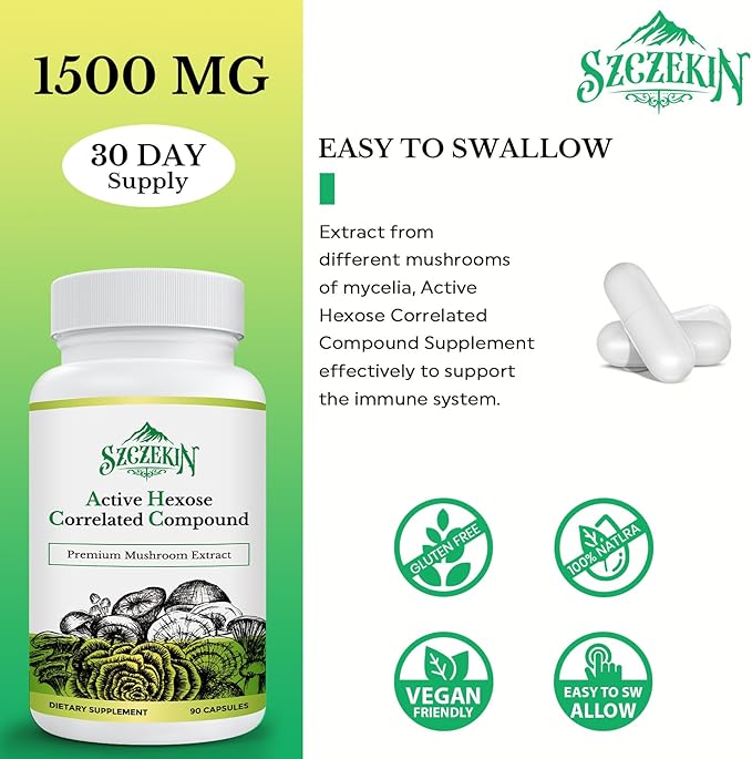 - 1500 MG HIGH POTENCY BLEND: Active Hexose Correlated Compound is a mushroom extract developed from mushroom mycelia, which is reported to impact the number and activity of immune cells, including natural killer (NK) and T cells. Our supplements Contain 90 vegan capsules. Take 3 capsules per day. The Active Hexose Correlated Compound 1500mg provided per serving can have a massive impact on your daily life and whole body