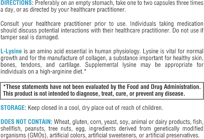 - Contains 500mg l-lysine per capsule.