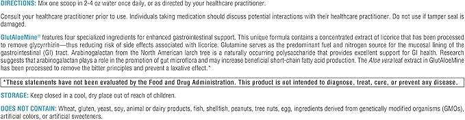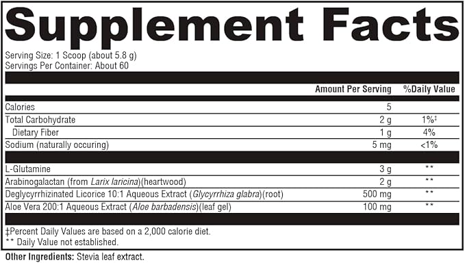 - Four specialized ingredients for enhanced gastrointestinal support: L Glutamine, deglycyrrhizinated licorice, aloe barbadensis leaf extract, and arabinogalactan powder.* Just mix one one scoop into 2-4 oz water.