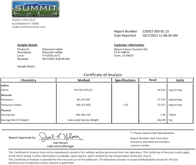 - ASSURED PURITY - Our Potassium Iodine Drops, potassium iodide tablets, and potassium iodine pills utilize Potassium iodide crystals of USP grade directly sourced. We provide third-party lab tests assessing heavy metals, potency, purity, and various other factors.
