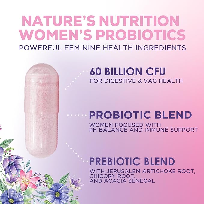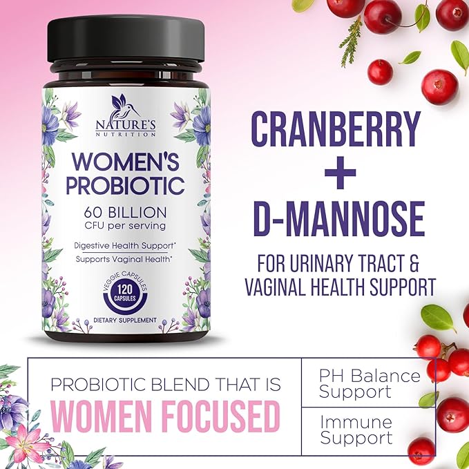 - PROBIOTICS FOR WOMEN: 60 Billion cfu Nature's Nutrition daily womens probiotic pills supplement with strains lactobacillus acidophilus cranberry digestive gut feminine health vaginal ph balance support and best prebiotics female probiotics capsules hello no gummies gummy choice vitamins prebiotic raw probioticos para mujer vaginial nature formulated woman vag care digestion probotic lovely pre biotic vaginigal probotics supplements 40 50