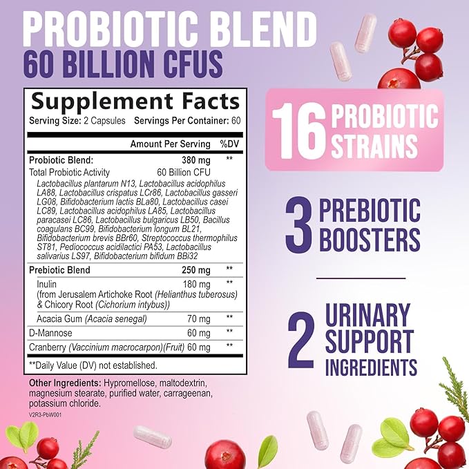 - TARGETED GUT & URINARY SUPPORT: Combining prebiotics and probiotics for women with cranberry extract, these probiotic pills work to balance gut microbiota and maintain a healthy urinary tract