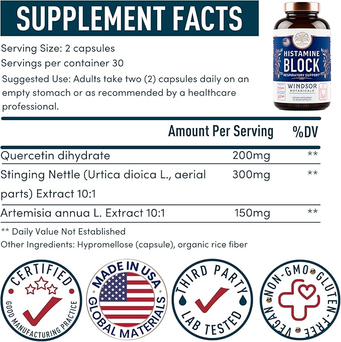 - VEGAN & GLUTEN-FREE. Each easy-to-swallow capsule contains a potent 650mg blend of stinging nettle extract, artemisia annua, and quercetin - completely free from GMOs, gluten, and artificial additives. For best results, take two capsules daily.