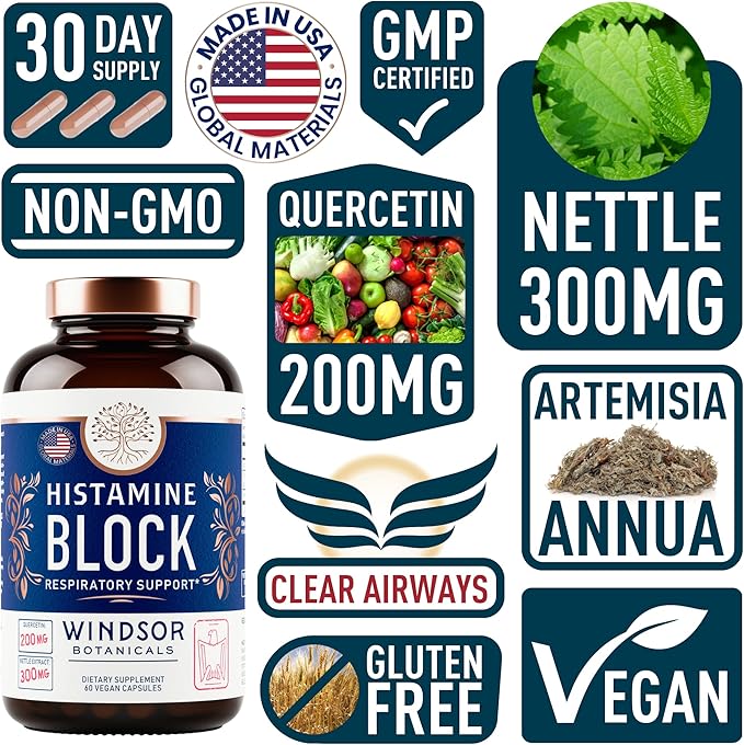 Histamine Blocker for Allergies - Quercetin, Stinging Nettle Flavonoids Natural Antihistamine Tablets - Allergy Relief Supplements & Antihistamines for Adults - 60 Vegan Histamine Block Capsules