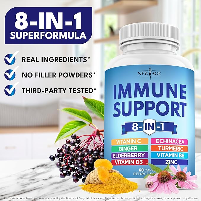 - 8 Powerful Immunity Ingredients –New Age has formulated the best potent immune support capsule packed with over 1550mg per serving of the top 8 immunity boosting ingredients. Sambucus Elderberry with Turmeric and Ginger help provide antioxidant support, Zinc citrate oxide (an essential nutrient) helps to promote immune function, we’ve added Vitamin D3 5000 IU, Vitamin C, and Echinacea to bring you a powerful elderberry supplement great for any season and B6 for daily energy