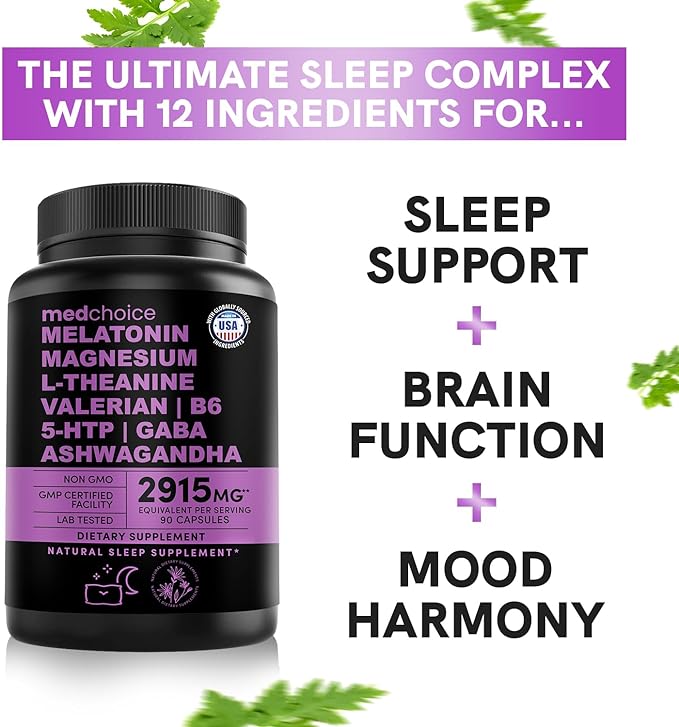 12-in-1 Melatonin Sleep Capsules - Natural Sleep Aids for Adults with Melatonin 5mg and Magnesium Glycinate 500mg, Sleep Aid with Ashwagandha, L Theanine, Valerian Root, GABA, 5-HTP (90ct, Pack of 3)
