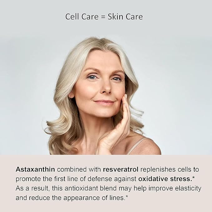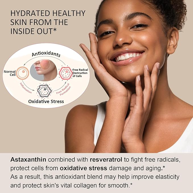 - Powerful Antioxidants and Skin Health: Astaxanthin is one of the most powerful natural antioxidants, helping to protect cells from free radical damage and also stimulating collagen production, while the added 500mg of Resveratrol is a powerful combination of antioxidants that help scavenge oxidation-generated free radicals and support overall skin health.