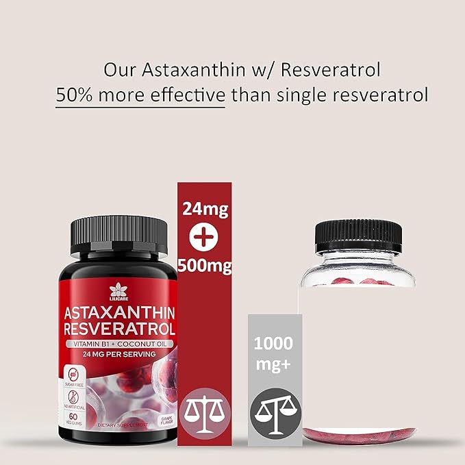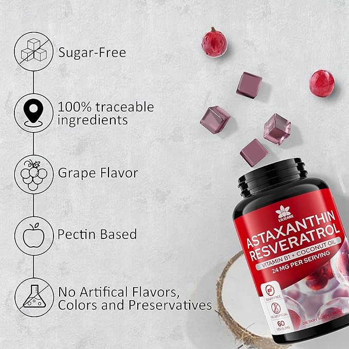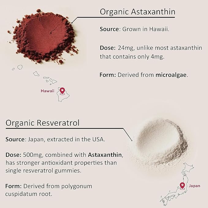 - Sugar-free Astaxanthin Gummies: Organic 24mg astaxanthin supplement extract from Haematococcus pluvialis microalgae in Hawaii, combined with 500 mg resveratrol and vitamin B1 to support healthy aging & skin, eyes, joint, immunity and brain function. Plus coconut oil to increase the absorption of astaxanthin and resveratrol by 50%. 1 gummy daily, 4 months supply.