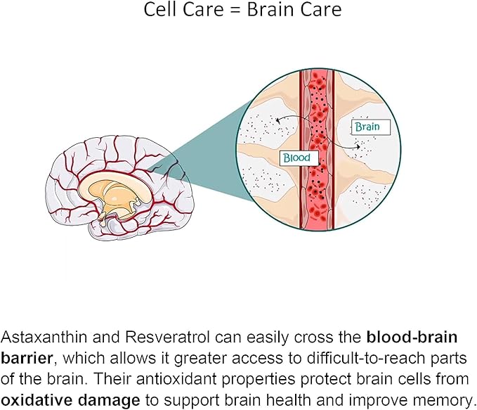 - Brain Health & Memory: Astaxanthin and resveratrol can easily cross the BBB, which allows it greater access to difficult-to-reach parts of the brain. This antioxidants supplement can protect brain cells from oxidative damage to support brain health and may improve memory.