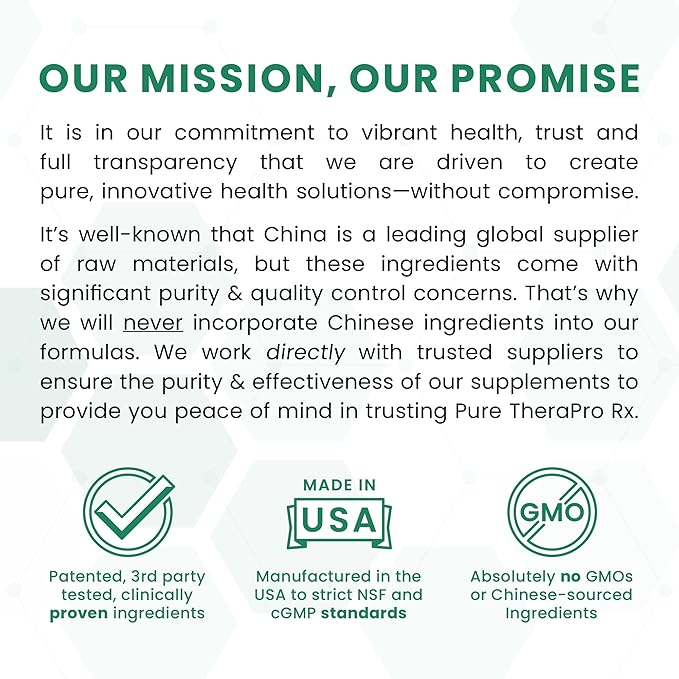 - 𝐀𝐁𝐎𝐔𝐓 𝐔𝐒: Pure TheraPro Rx was founded in Denver Colorado to formulate and manufacture the highest quality supplements available on the market today. Purity is our priority, which is why we insist on using patented, clinically studied ingredients, and never utilizing fillers, flow agents, excipients, or ingredients sourced from China. We also never use dairy, gluten, corn, soy, or other common allergens in any of our class-leading, practitioner-recommended formulas.