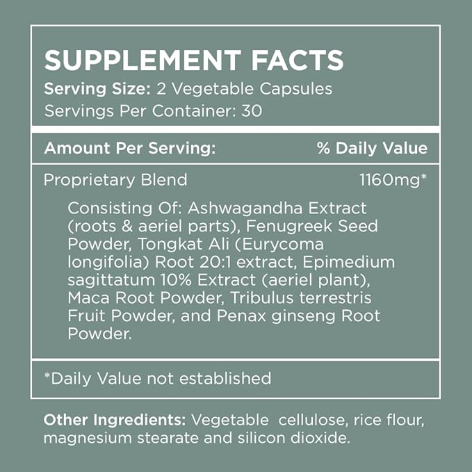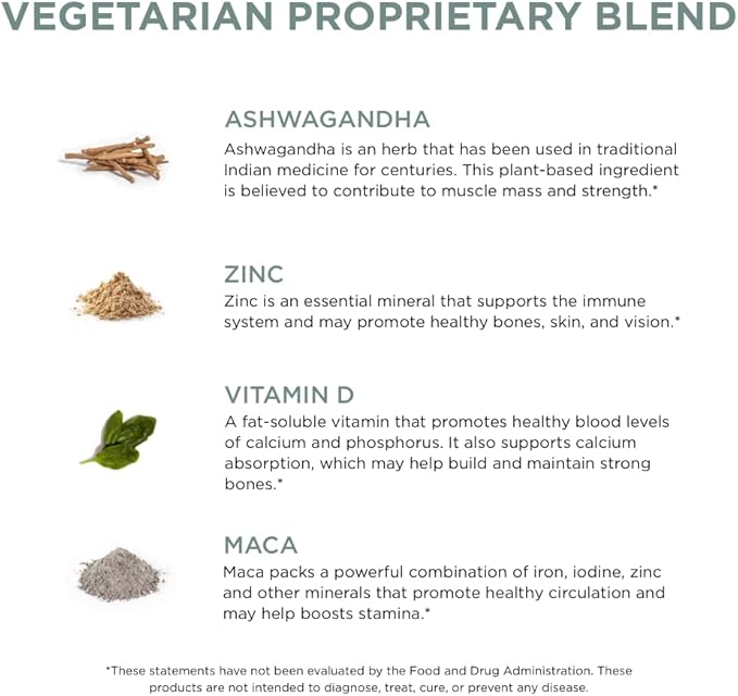 - VEGETARIAN PROPRIETARY BLEND: Helps stimulate your body's ability to retain muscle, making it easier to achieve your gym goals. Fuel your daily performance with our proprietary blend of key ingredients like Ashwagandha, Zinc, Vitamin D, Maca, and Tongkat Ali.*