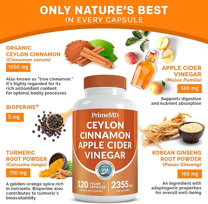 - What are the ingredients - Our vegan cinnamon capsules include apple cider vinegar, turmeric, Panax ginseng, ceylon cinnamon & BioPerine for more absorption. They're gluten free, GMO-free & 3rd party tested.