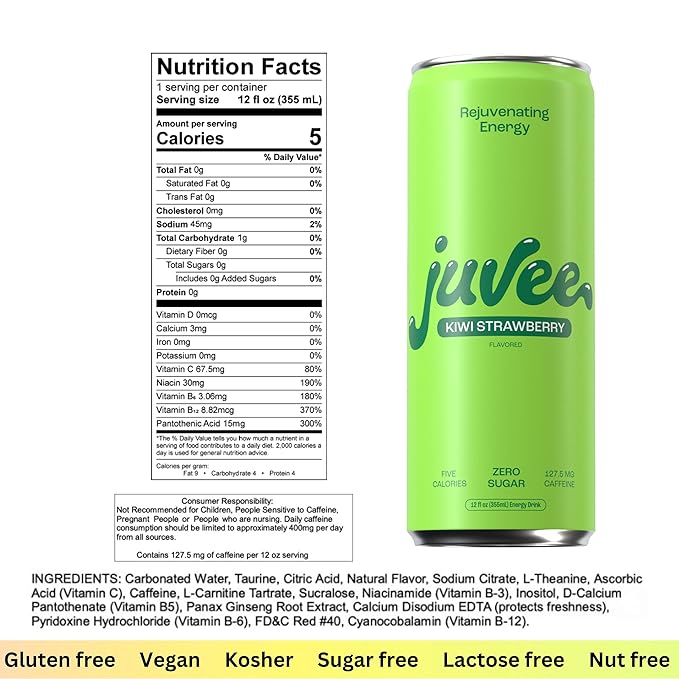- Energy To Power Your Play: Juvee's a new class of healthy energy drinks with a unique combination of natural energy boosting B vitamins, taurine, and caffeine, to leave you feeling rejuvenated and ready to take on the day. Unlike other zero sugar energy drinks, there's no crash and burn here. With 128 mg of caffeine (like a double espresso shot) and just 5 calories, Juvee's the clean energy drink here for a good time and a long time to help you do your thing, your way, as long as you want!