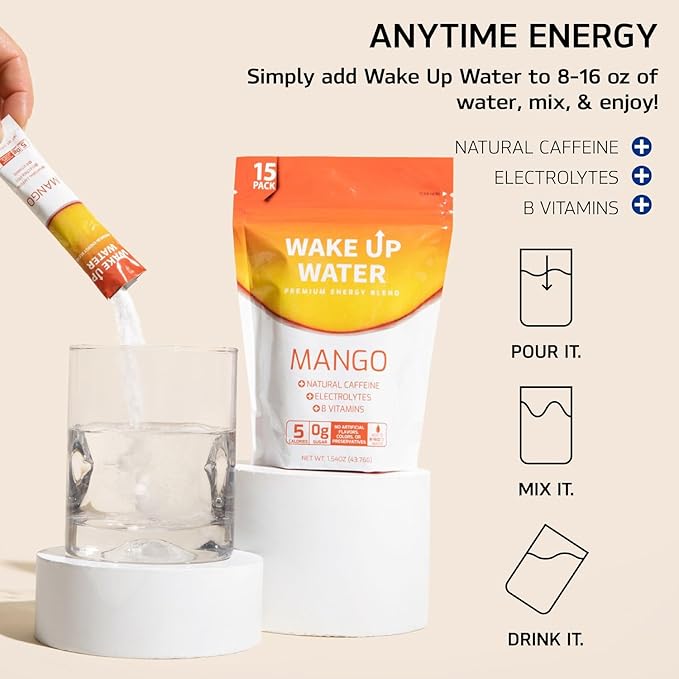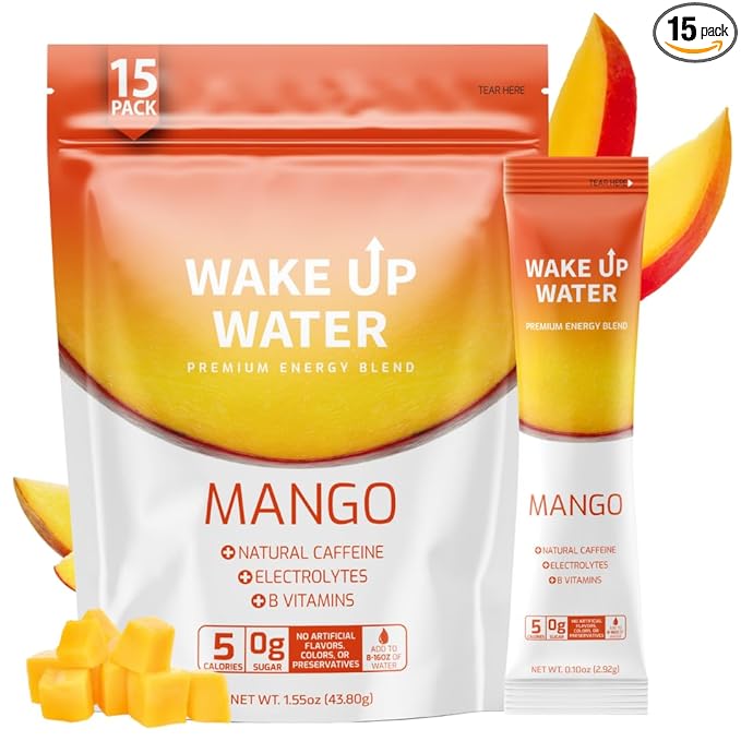 - Energize Your Day: Wake Up Water redefines your water as a light, refreshing drink mix that combines natural energy and hydration. This invigorating Mango flavor has crisp, fresh-sweet notes delivering just the right amount guilt-free indulgence.