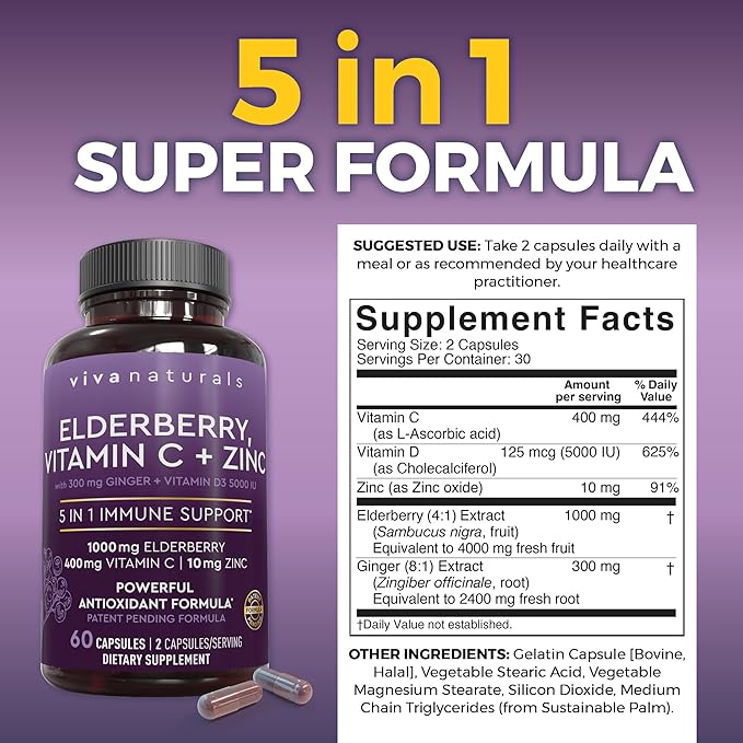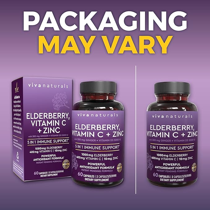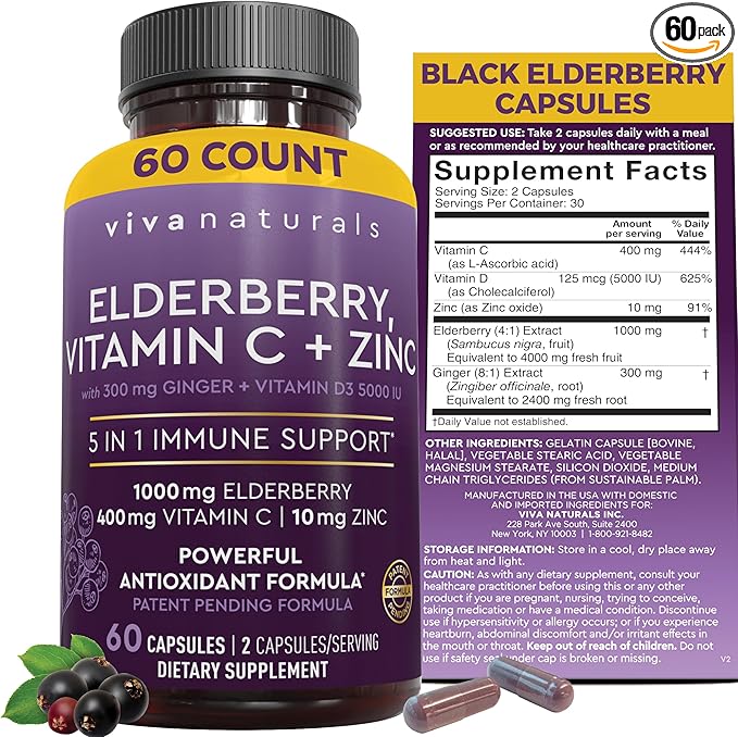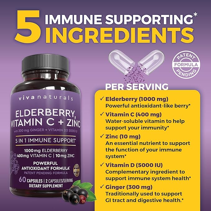 - ELDERBERRY EXTRACT WITH ZINC AND VITAMIN C – Viva Naturals Elderberry supplement for adults combines the strength of five high quality immune supporting ingredients.* We have added a high potency of Vitamins C and D for extra support of immune health.*