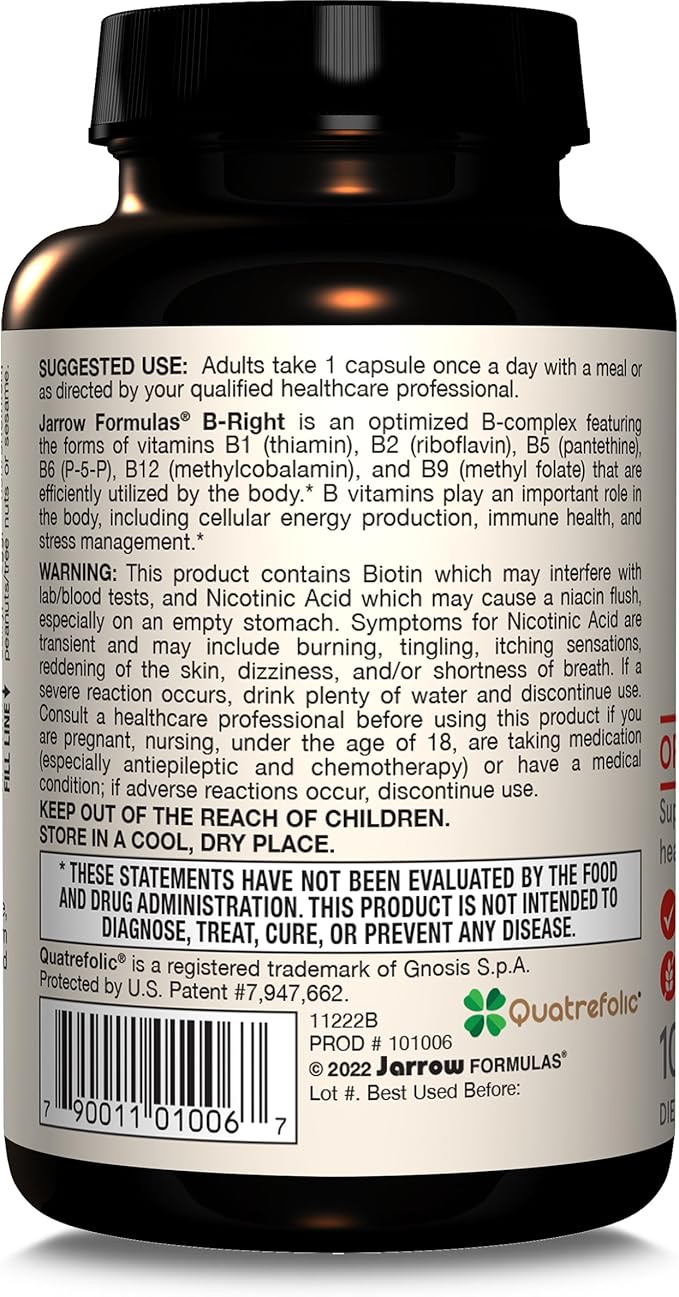 - OPTIMIZED B-COMPLEX: Jarrow Formulas B-Right, Optimized B-Complex featuring vitamin B1, vitamin B2, vitamin B5, vitamin B6, vitamin B9 and vitamin B12 support cellular energy, immune health and stress management(1)