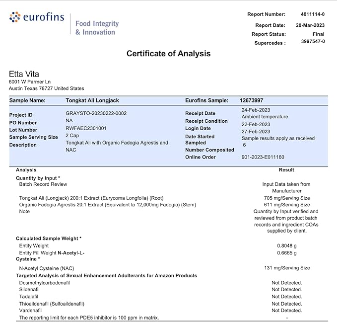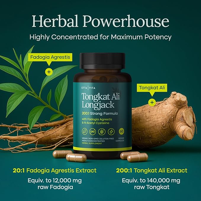 - [2x Purity - Fadogia Agrestis 20:1]: Etta Vita's tongat-ali 700mg with fadogia agrestis 600mg supplement is carefully formulated to support overall well-being and vitality. While the market standard is 1:1 – 10:1, ours is 20:1, lending more impact on hormonal balance stimulation.