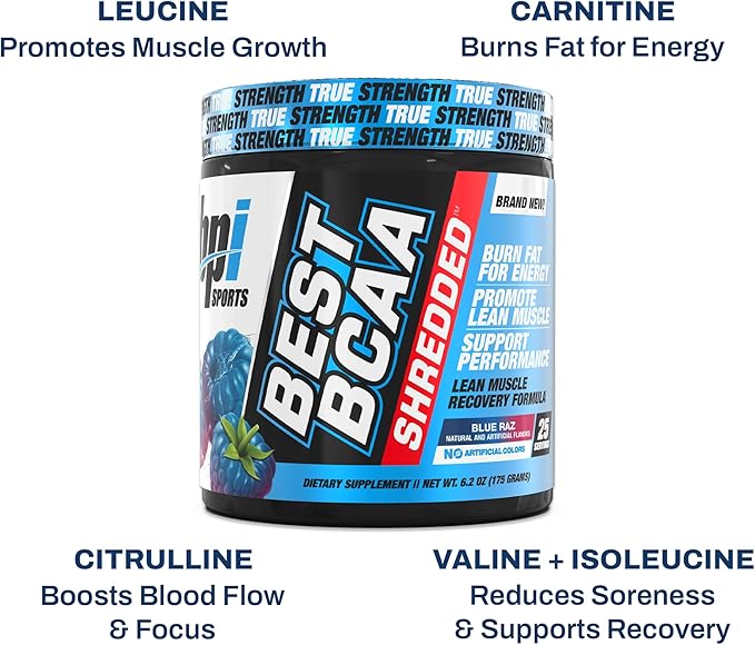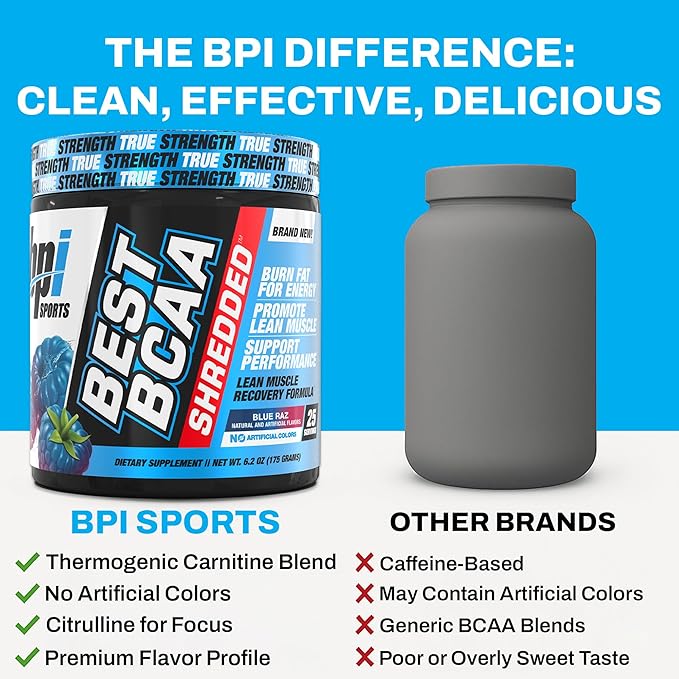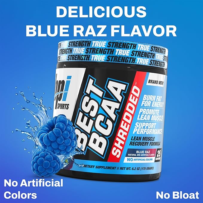 BPI Sports Best BCAA Shredded - Caffeine Free Thermogenic Recovery Drink, Lean Muscle Building BCAA Powder for Women and Men, Preworkout BCAAs Amino Acids Drink- Blue Raz - 25 Servings