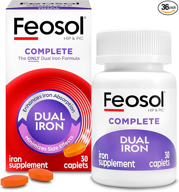 Feosol Complete Iron Supplement Caplets, Bifera Iron for High Absorption, Heme and Non-Heme Dual Action Minimizes Side Effects, 1 Per Day, for Energy and Immune System Support, 30 Count (Pack of 36)