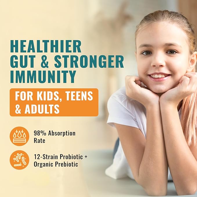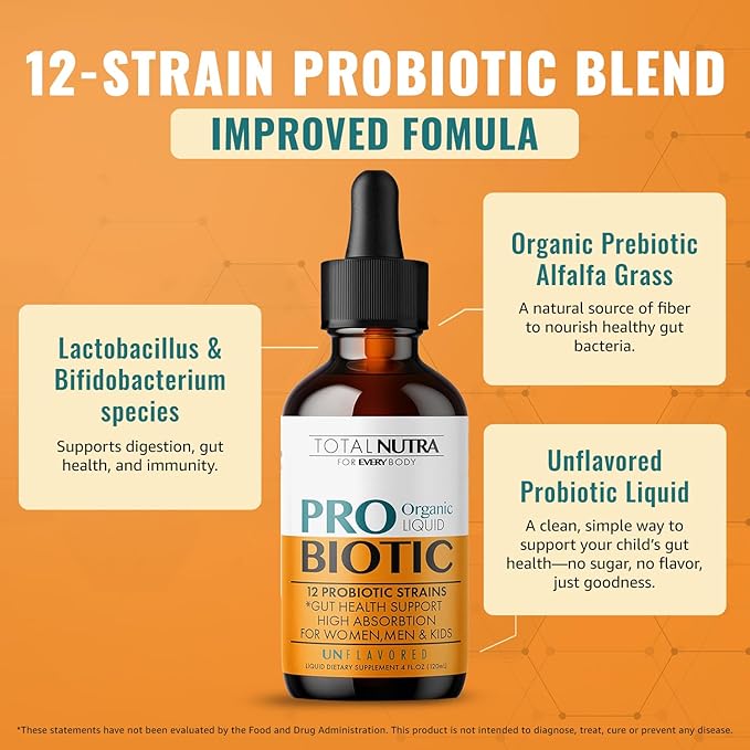 - 12-STRAIN PROBIOTIC ORGANIC BLEND: With 1 daily dose of our liquid probiotic for kids & adults, you’ll benefit from 12 powerfully beneficial probiotic nutritional supplements, plus fiber-rich, natural prebiotic alfalfa grass to promote a healthy gut microbiome. This lactobacilli probiotics formula may support a more efficient digestive tract, leading to more comfortable digestion, boosted immunity, and decreased digestive issues.