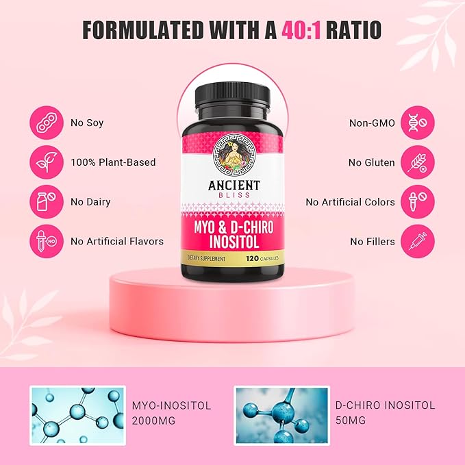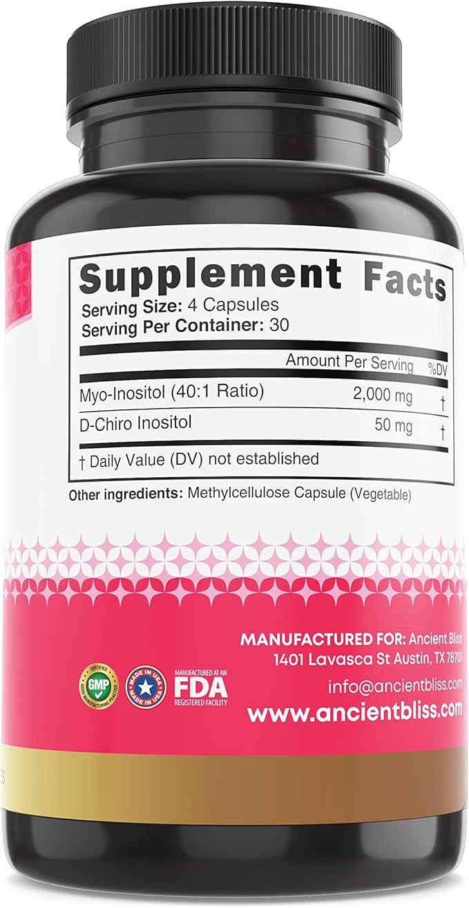 Ancient Bliss Myo & D-Chiro Inositol Supplement, 40 to 1 Ratio, Helps in Ovarian Function Support for Women, Vitamin B8 Helps to Regulate Menstrual Cycle, 2050mg per Serving, 120 Vegan Capsules