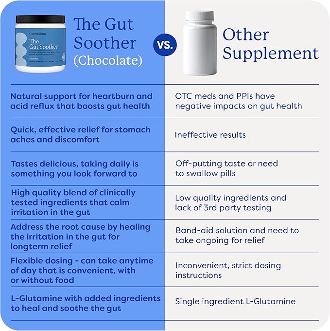 - Start with ½ scoop and increase to a full scoop after a few days. Available in delicious chocolate and vanilla flavors, The Soother is the perfect addition to your morning or evening routine for optimal gut health.